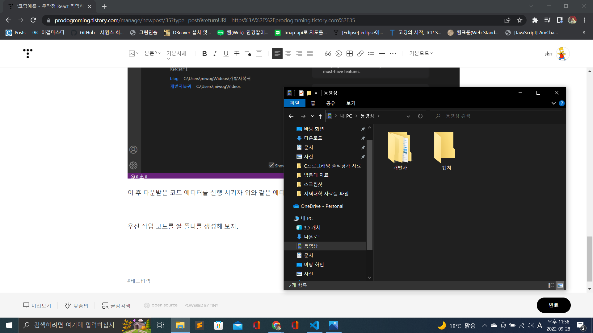 우선 작업 코드를 짤 폴더를 생성해 보자. 나는 동영상이라는 곳에 개발자라는 폴더를 만들었다. 그러면 다시 돌아가서 에디터에서 해당 폴더를 오픈해보자.