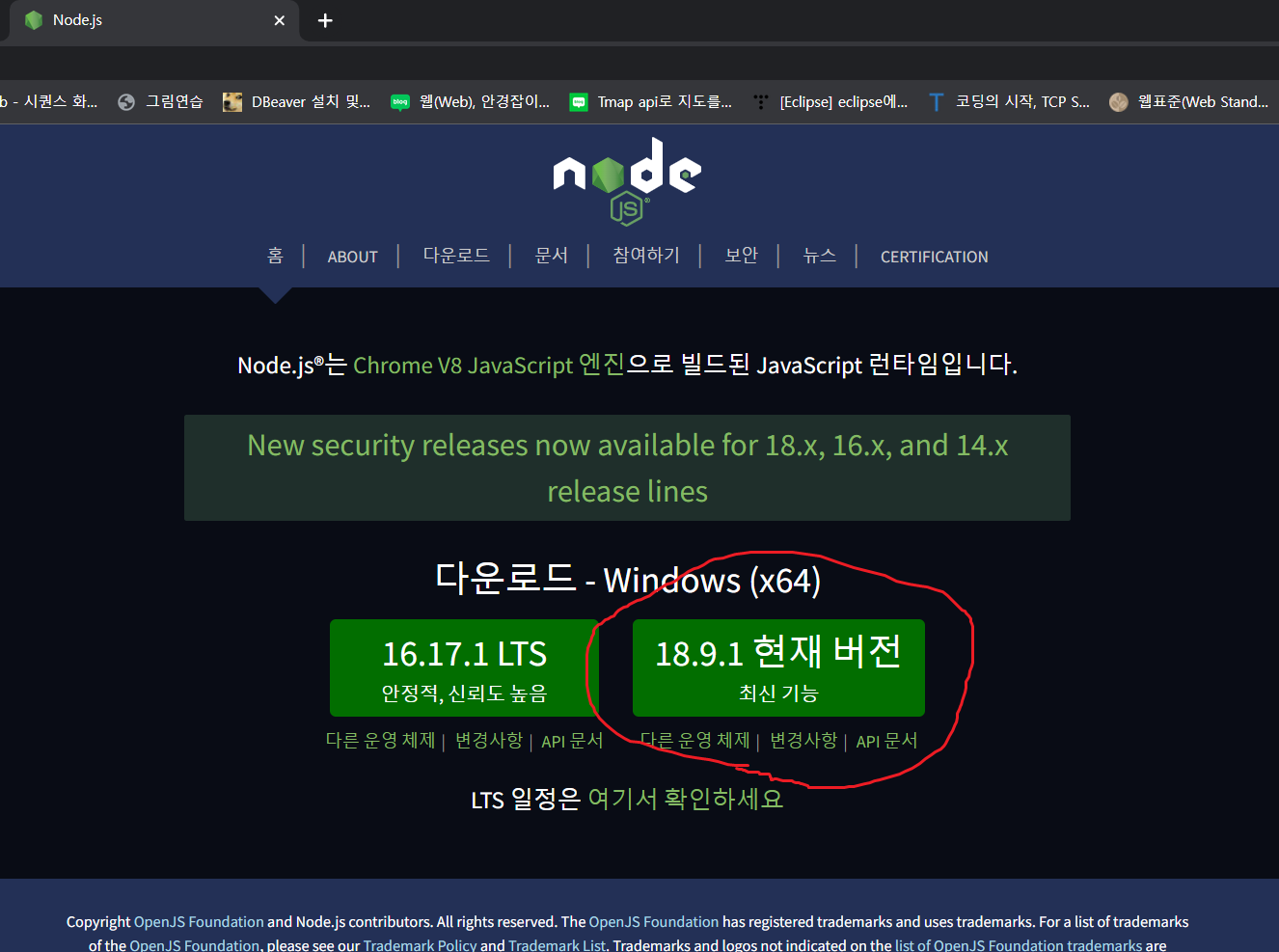 우선 구글에 nodejs 검색 후 첫번째 뜨는 공식페이지의 가장 최신 버전을 다운로드 한다.