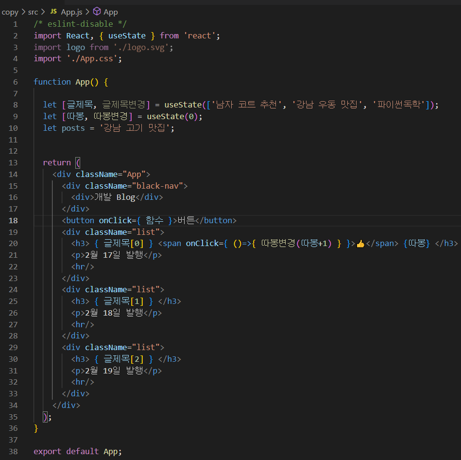 글제목변경(['여자코트 추천', '강남 우동맛집', '파이썬독학']); // <= 아예 state를 대체해주는 함수
