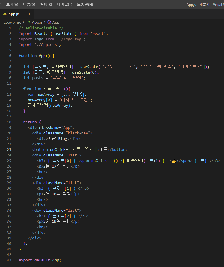 제목바꾸기라는 함수를 만들 것이다. 여기서 주의할 점 하나는 onClick={}안에 함수를 넣는다고 해서 제목바꾸기() 이런식으로 함수를 추가해 버린다면 클릭하기도 전에 바로 함수가 실행 될 것이다. 주의 하도록 한다!. 제목바꾸기 함수를 완성해보자.