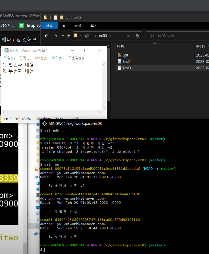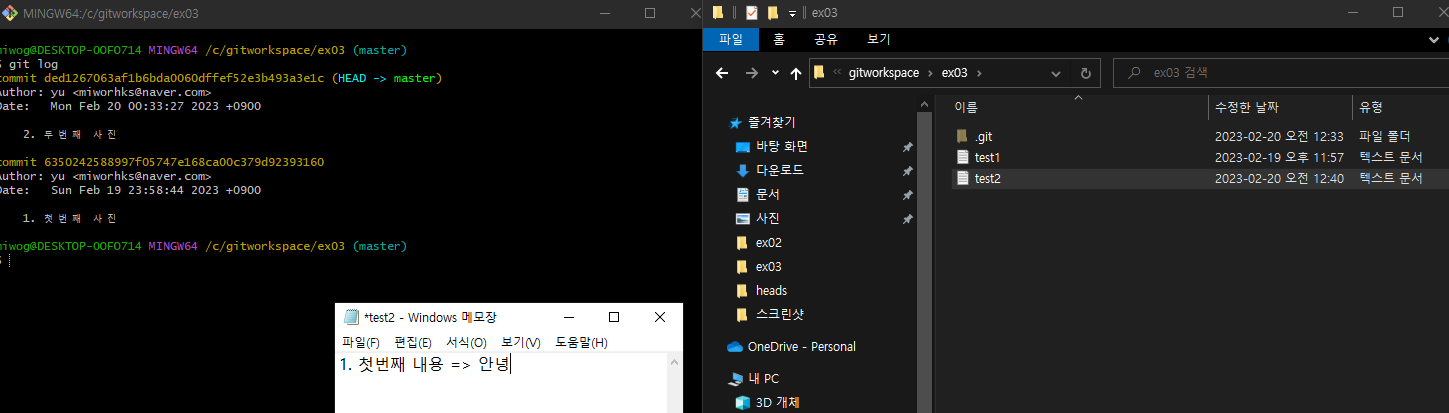 위 처럼 c:drive에 만들었던 gitworkspace의 폴더에 ex03폴더를 생성 후 git bash CLI를 키고 git init후 test1, 2 파일을 다음과 같은 내용으로 만든 후 git add . 를 한 후 커밋을 해 준다. 그러고 깃 로그를 확인 해 보자.
