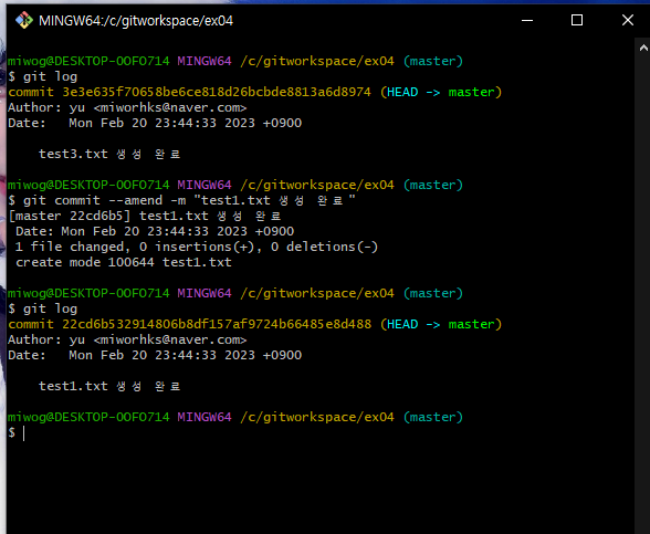 이런 식으로 git commit --amend -m "들어갈 내용" 명령어를 입력하면 최종 로그가 변경이 된다.