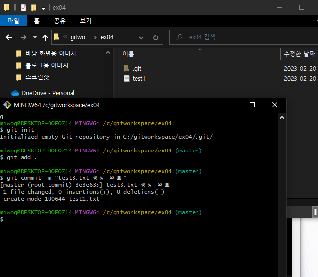 이제 다시 gitworkspace로 돌아가서 ex04폴더 안에 git init 후 test1.txt 파일을 생성 하고, add & commit을 해주자.