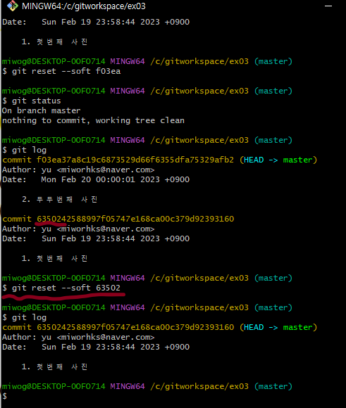 git reset --soft 해쉬값 이런식으로 넣어주면 된다. 그니까 현재 바꾸고자 하는 로그 앞의 헤드의 해쉬값을 입력 해 주면 되며, soft 뒤에 해쉬값은 635024~~ 다넣어줄 필요없이 다른 파일들의 해쉬값과 겹치지않을 정도 4자~ 5자만 입력하면 자동으로 알아서 찾아준다. 다시 올바른 메세지로 git commit을 해주고 log를 확인 해 주면