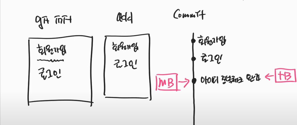 현재 상태는 TB에서 작업을 하던 중에 MB에 글쓰기라는 기능을 만들때 이때 실제로 가지가 생기게 되는 것이다.