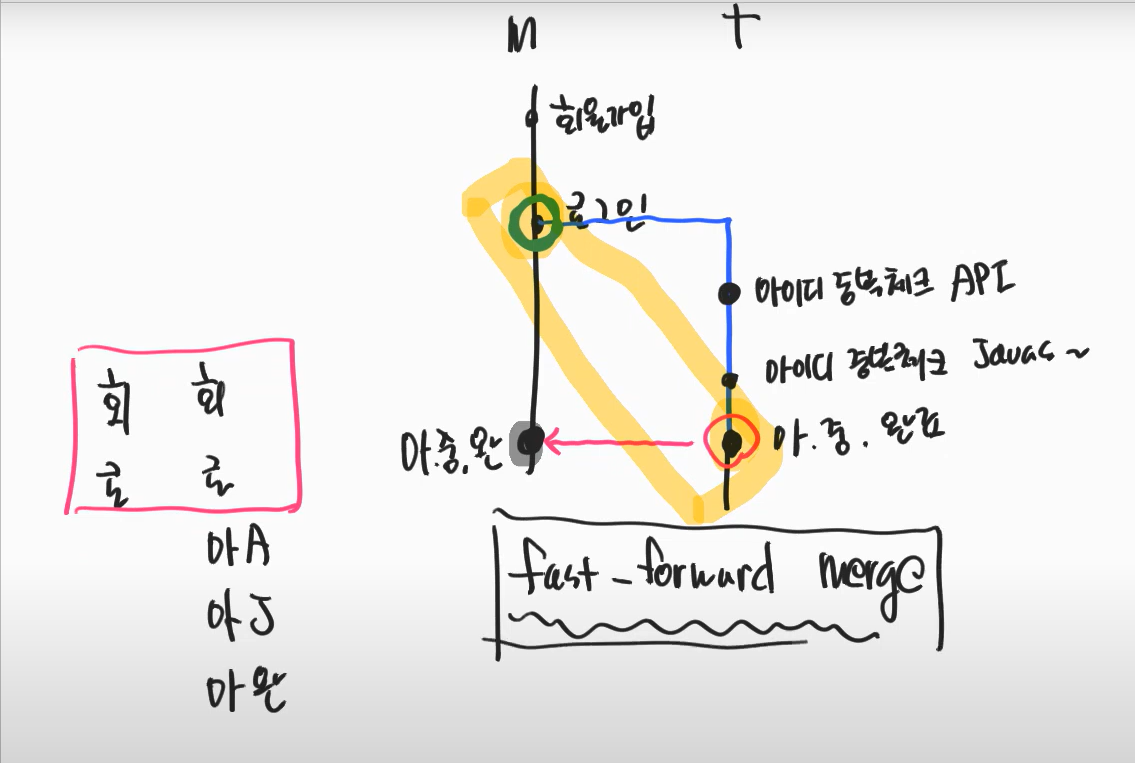 그러면 Git에서 알아서.. 위에 그림처럼 제일 끝점(로그인, 글쓰기 ,아이디 중복체크완료) 3개로 합쳐준다.. 이것을 merge 라고 한다.